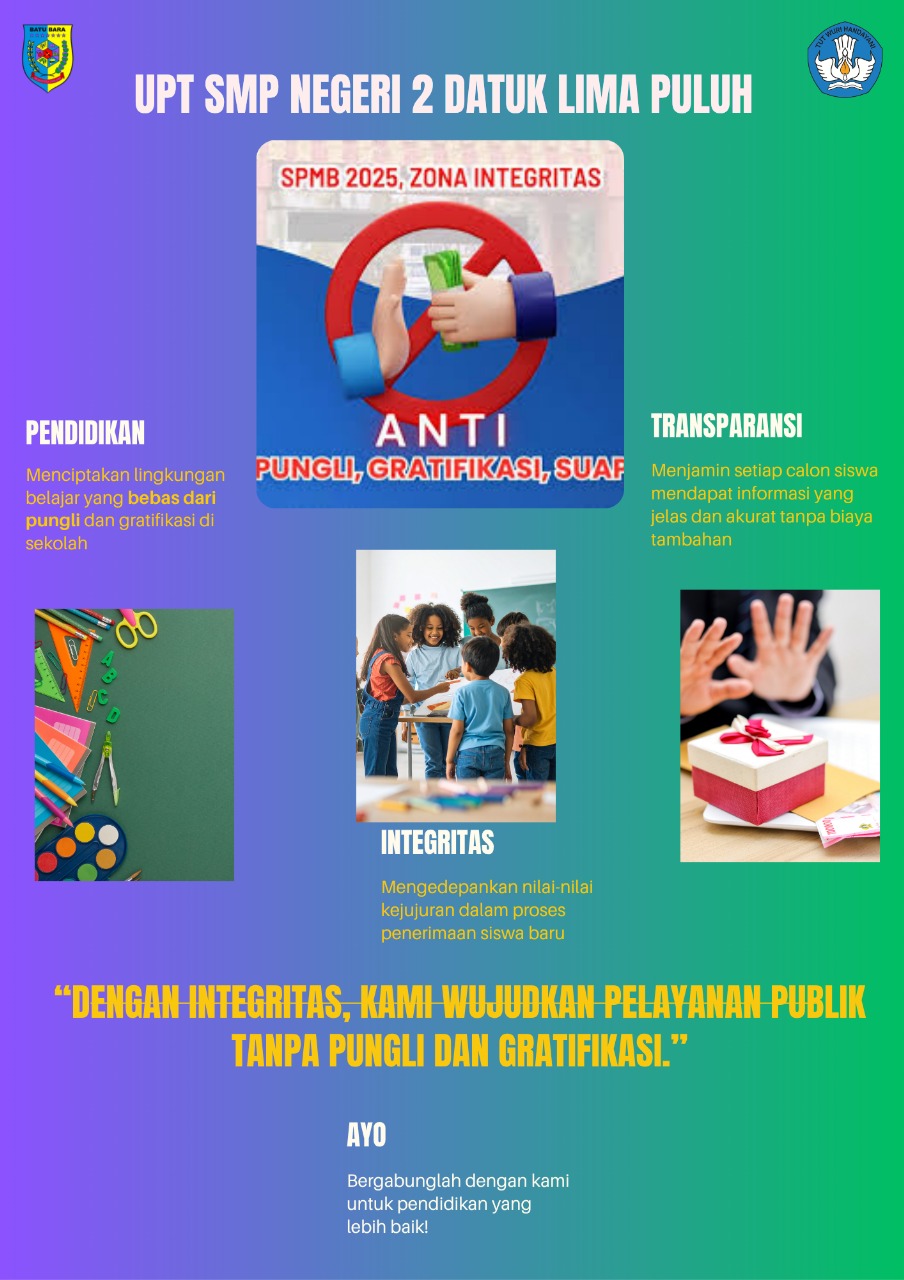Informasi selengkapnya mengenai syarat pendaftaran, jadwal, dan mekanisme PPDB akan diumumkan melalui papan pengumuman sekolah dan media resmi SMPN 2 Datu Lima Puluh.
